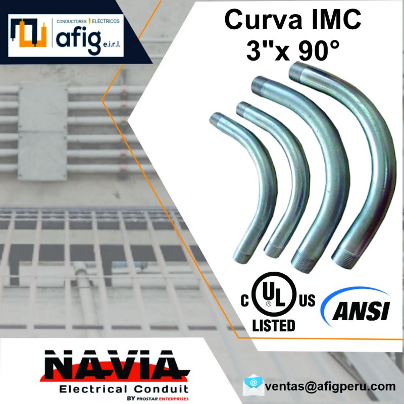 Las Curvas IMC se utilizan para conectar tubos IMC en un ángulo de 90° y cambiar la dirección de la instalación. Son fabricadas en acero galvanizado en caliente, bajo la norma UL 1242, ANSI C80.6